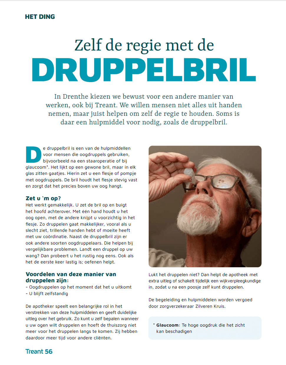 Vanaf 1 november 2025 is ogen druppelen in Drenthe geen standaard zorgtaak meer. Cliënten worden gestimuleerd dit zelf te doen of weer aan te leren, eventueel met een hulpmiddel zoals een druppelbril. Samen met alle zorgpartners in de regio zetten we hiermee een stap richting meer zelfredzaamheid en toekomstbestendige zorg